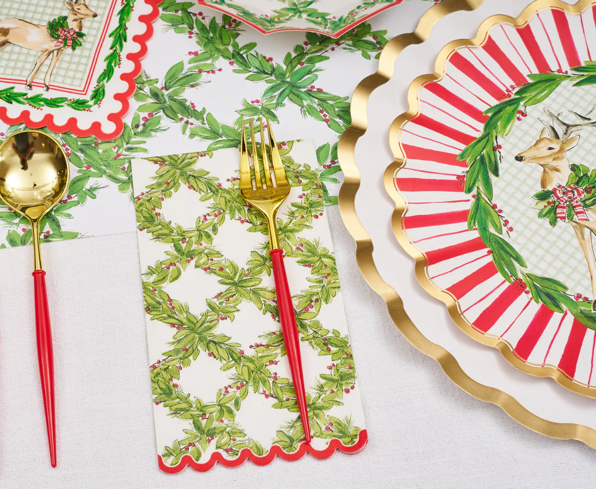 These guest towel napkins from our Holly Berry collection feature a festive trellis of lush Christmas greenery and bright holly berries. Finished with an adorable scalloped red edge, they add the perfect touch of charm to your holiday celebrations. Whether used as a stylish dinner napkin or as an elegant guest towel for your bathroom or powder room, they'll bring a touch of beauty to any occasion!